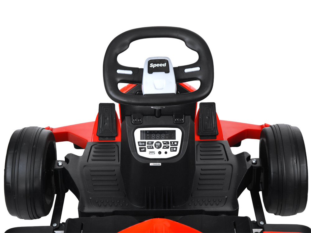 The battery-poweredgo-kart with remote control is designed for every little driver who likes sports cars. The kart is large, comfortable and also has a remote control for parents. The metal-framed kart has a plastic body, a comfortable seat and a sports steering wheel. It is equipped with a control panel for driving the vehicle, sound and light effects. The right pedal on the kart is the throttle and below the left pedal is the brake. The remote control in the kart is used to control the vehicle, but once the young driver has learned the rules of the road, the remote control will certainly only be used to stop the young driver if necessary.