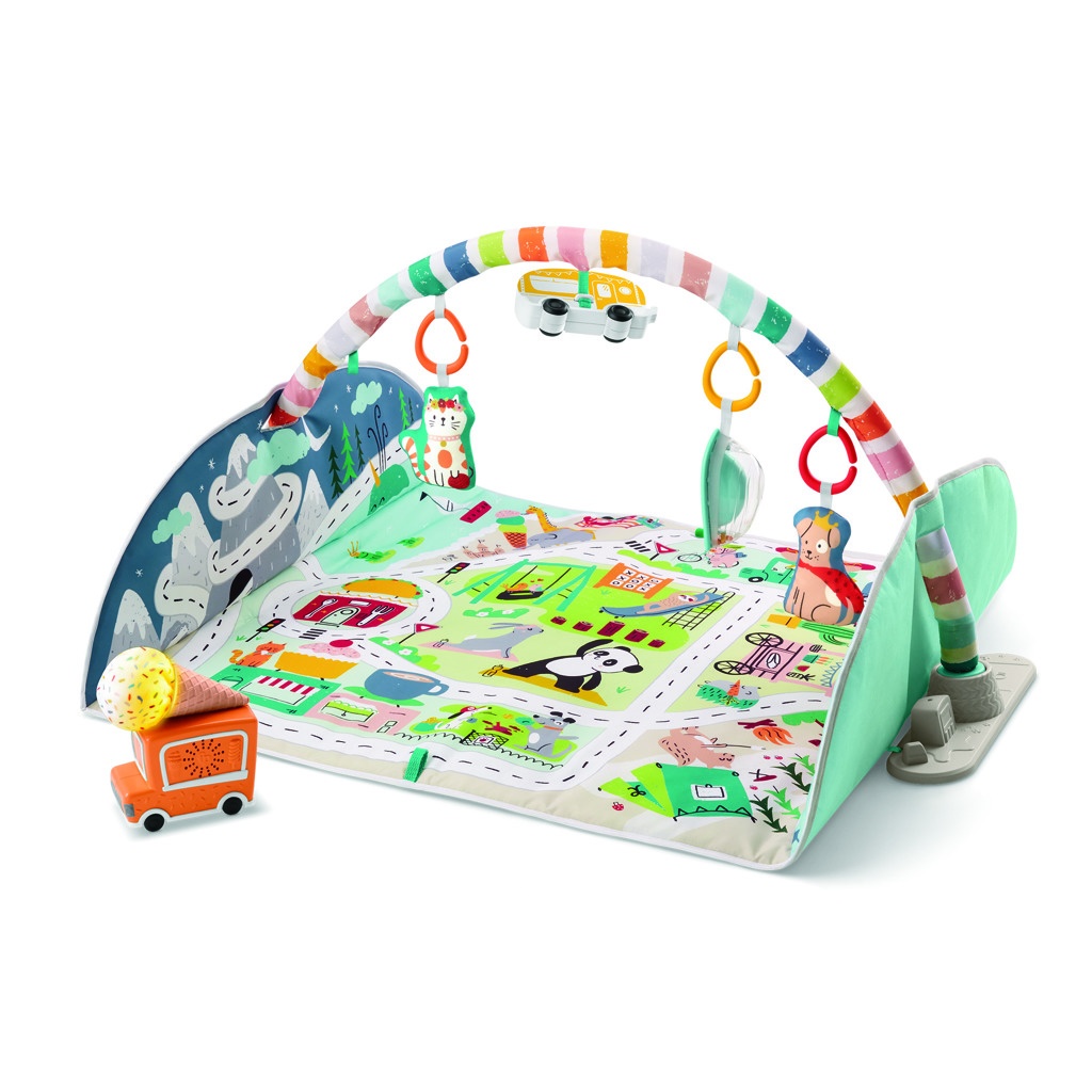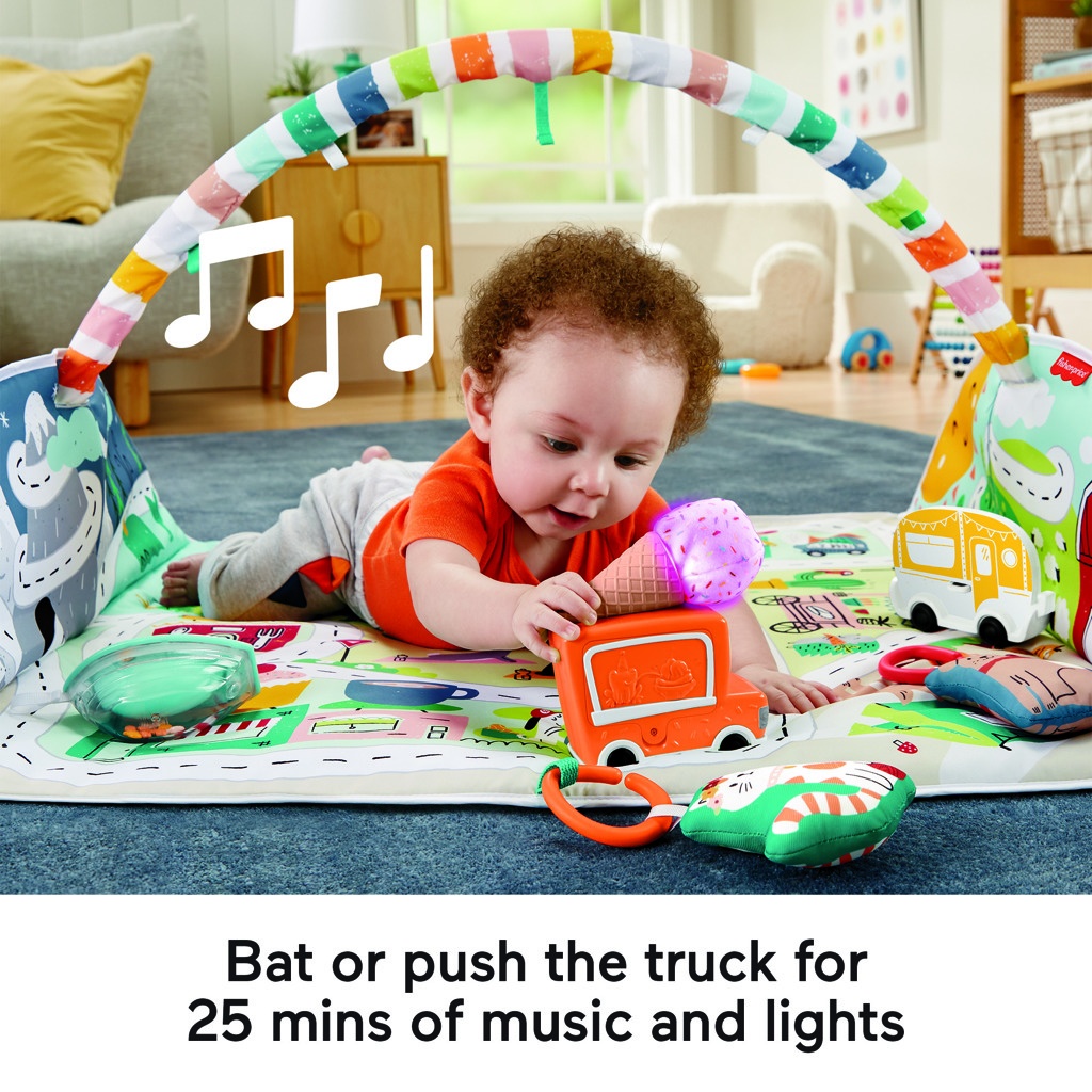The panda and the sloth are workout buddies, and the ice cream truck supplies the snowy mountains with treats. Fisher-Price® Play Mat with Activities offers nearly 120 cm of space for your baby to explore while lying down and playing, doing tummy time, or sitting and observing everything around. The mat includes 7 toys, including a mirror and durable toys, which are attached to a removable arch. And on top of all that, a pull-along ice cream truck that can play up to 25 minutes of music. As your children grow, the blanket becomes a track on which toddlers can move vehicles from the farm, over the snowy mountain peaks, and into the city.