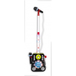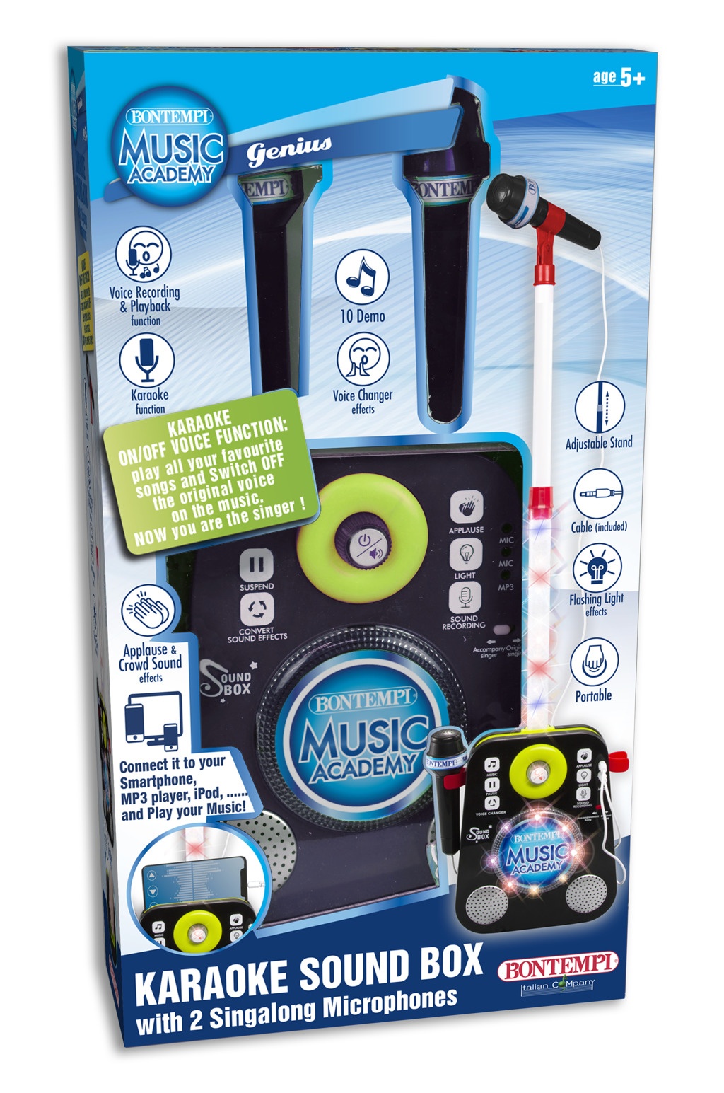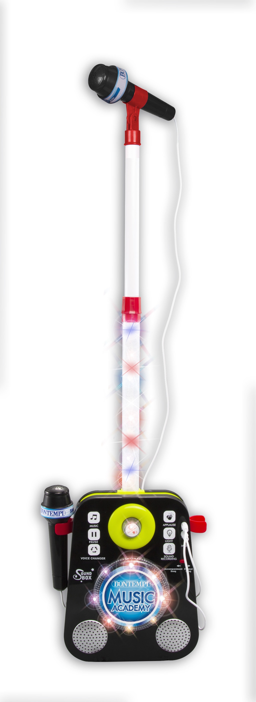 Karaoke with 2 microphones and a music box has 2 adjustable microphones with light effects, 10 preset demosongs, applause and cheers from fans, activation button for light effects, recording and playback of your own melodies, voice changer effects. Karaoke function to mute the vocals in songs so you can sing alone with only the melody. Connection to MP3 player, smartphone, iPod, CD player, etc.includes cable.