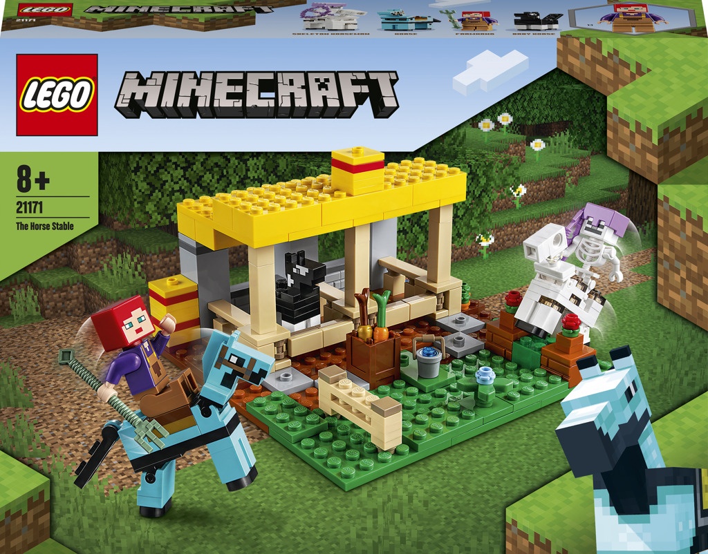 Kids who love to create, rebuild and use their imagination will love this versatile LEGO Minecraft set. The stable has an opening door and is full of authentic Minecraft details, such as a golden carrot and diamond armour. Kids can feed and care for the horses, build obstacle courses and battle with a skeleton rider! This creative, rebuildable set is the perfect gift for both Minecraft players and little horse lovers.""- Adventures in the horse stable in the realm of Minecraft™ come to life with versatile LEGO® bricks. - There is a horse, pony, farm help, skeleton horse and fun accessories. - Children can look after the horses, build an obstacle course and compete against a skeleton! - A great gift for Minecraft™ fans and horse lovers aged 8 and up. - The model is suitable for play and display and can be combined with other LEGO® Minecraft™ sets. - Included are hay bales, golden carrots, diamond armor for horses and other accessories.- LEGO® Minecraft™ bricks offer players a new way to enjoy their favourite game. - LEGO® building blocks meet strict industry quality standards. - LEGO® pieces meet the highest safety standards in the world."