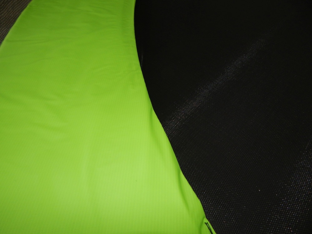 The rebounding surface of the trampoline is made of polypropylene fabric (PP Mesh) with a water resistant surface. The upper protective net has a zippered entrance with a safety lock to prevent unintentional release.