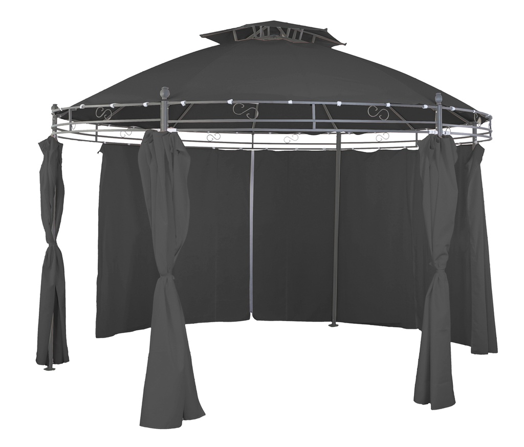 Garden gazebo equipped with a solid and stable structure, in circular design, with retractable hinges.