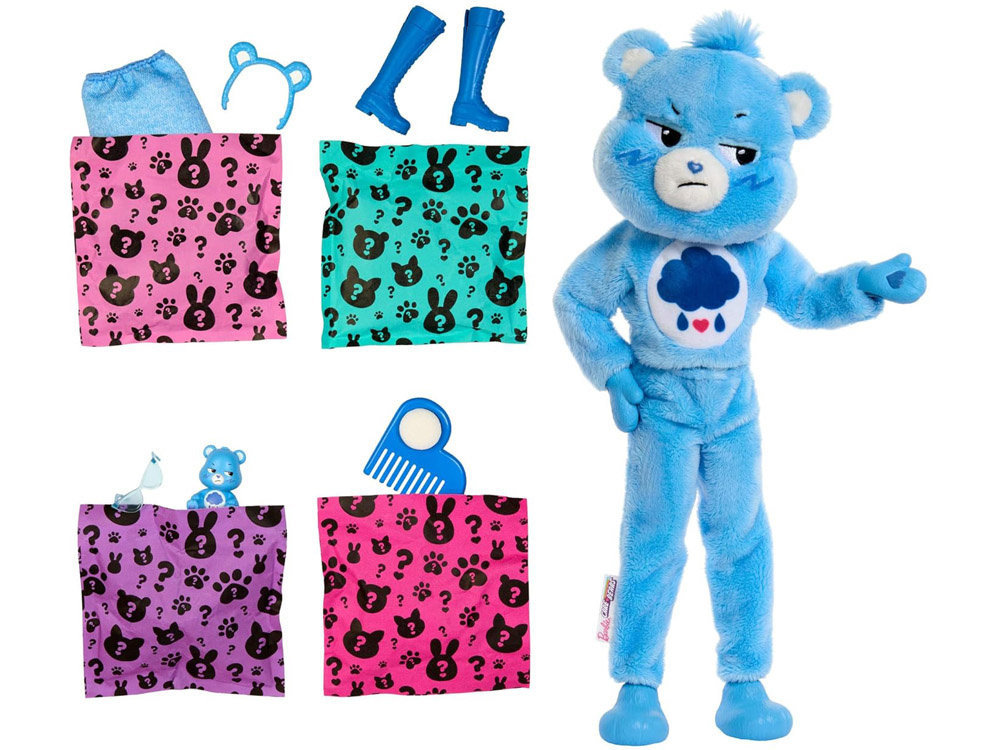Discover the amazing toy from the Barbie® Cutie Reveal™ series inspired by the iconic Care Bears. This time starring Gderek – a blue teddy bear with a grumpy look, but a big heart. A Barbie doll hidden in a soft, plush Grumpy costume is the perfect choice for children who love surprises, transformations, and creative play.