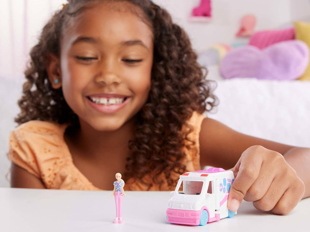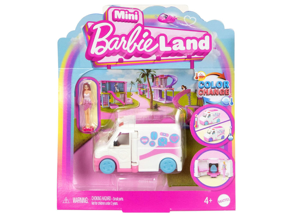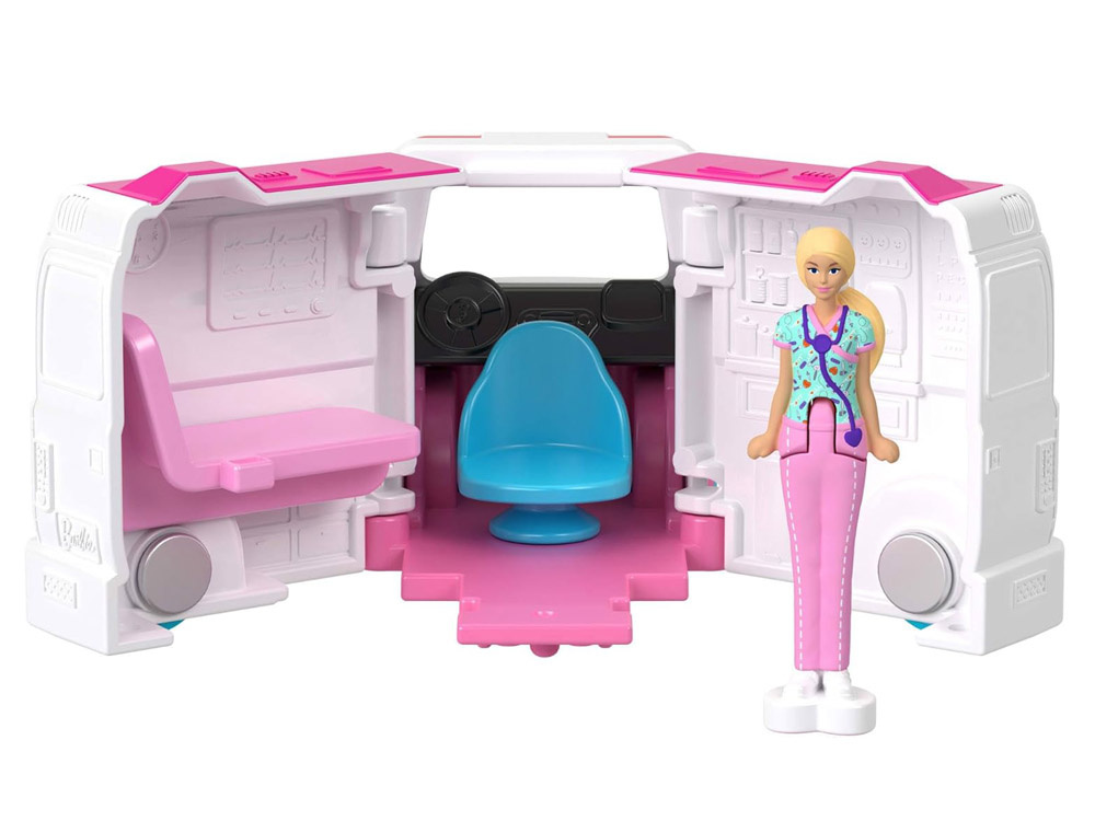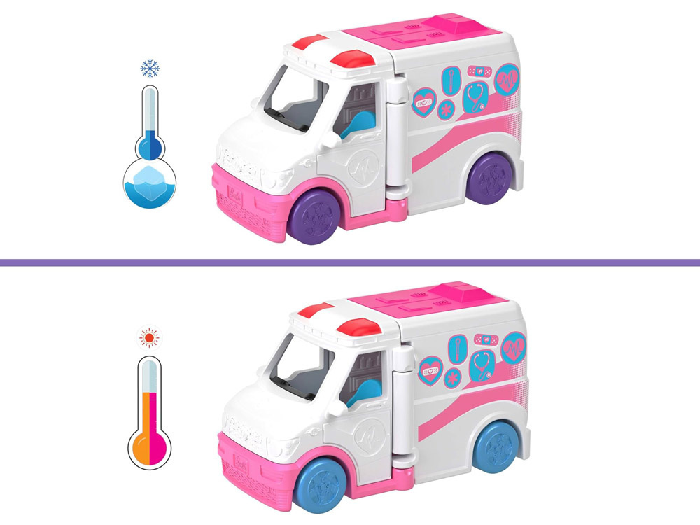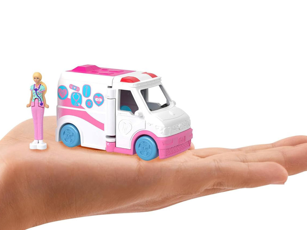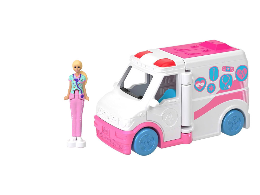The set features the iconic Barbie Care Clinic ambulance in a mini version. The vehicle opens up to reveal the interior of the clinic – a place where Barbie can take care of her patients' health.