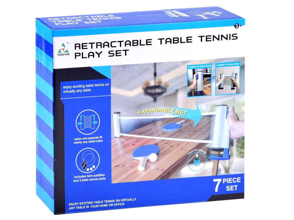 You can literally take this handy set anywhere and use it at will. All you need is a table top and you're done. The set includes an adjustable net, two rackets and three balls.