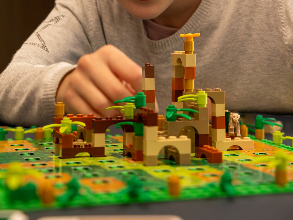 LEGO® Monkey Palace is a board building game where players build stairs from LEGO bricks on a special board. The goal is to create the tallest and most spectacular stairs that will bring points, monkey cards, and most importantly bananas – the main currency and measure of success in the game.