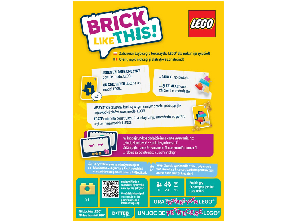 LEGO Brick Like This is a dynamic party game where cooperation, communication, and quick thinking are key. This is an excellent offer for both families and groups of friends. The task of the players is to build a LEGO model depicted on the card - but with a certain challenge. One person from the team sees the card and describes the shape, while the other – based on the clues – tries to build the model.
