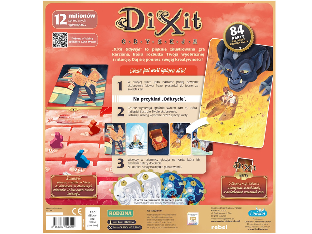 Dixit Odyssey is a universal game for the whole family and friends. Simple rules make it possible to play it immediately, regardless of board game experience. Gameplay develops creativity, spatial imagination, and the ability to empathize, helping to better understand the thought processes of other players. The game can also be used for educational and therapeutic purposes, supporting the development of speech and social skills. The refreshed version of Dixit Odyssey includes an improved manual, a practical board with spaces for cards and a scoring track, voting shields, and an insert that accommodates all game components and additional decks.