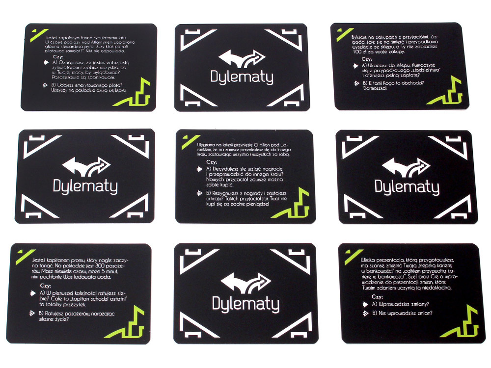 - The moderator draws a Dilemma card and reads it aloud. - The group discusses possible responses – one can persuade others, argue, or attempt to create confusion. - After the discussion ends, each person secretly chooses their answer ("A" or "B") and places the card face down on the table. - When everyone votes, the answers are revealed.
