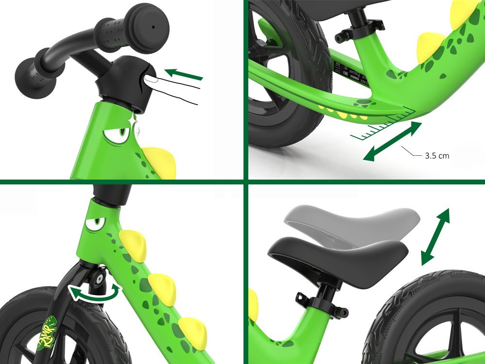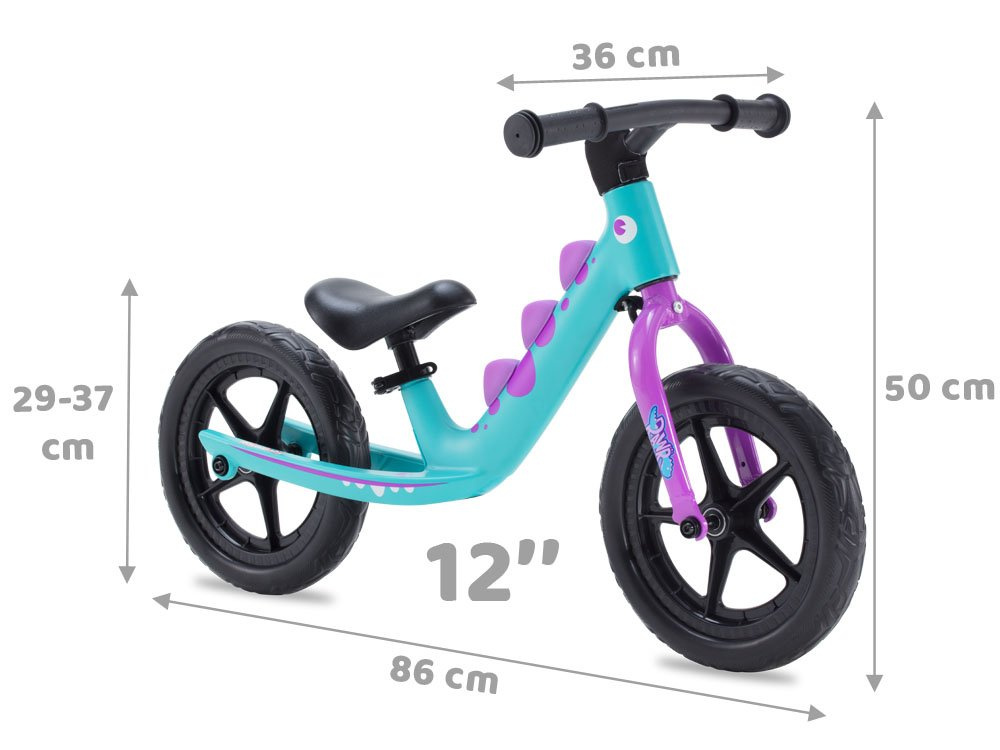 Balance Bike DINO RoyalBaby with 12-inch EVA Wheels is a lightweight and comfortable bike with dinosaur motifs. It is ideal for children from 3 years old. While playing, the child practices their sense of balance and overall coordination of movements, which are skills important for later riding a bicycle. Thanks to the adjustable saddle, the bike will grow with our little cyclist. Lightweight aluminum frame of the bike and the steering limiter in the handlebars ensure that your child can maneuver safely while riding. Royalbaby is a brand of bicycles designed for children. The products of this brand are characterized by high-quality craftsmanship, attractive design, and innovations. Royalbaby guarantees a safe and enjoyable ride for every child.