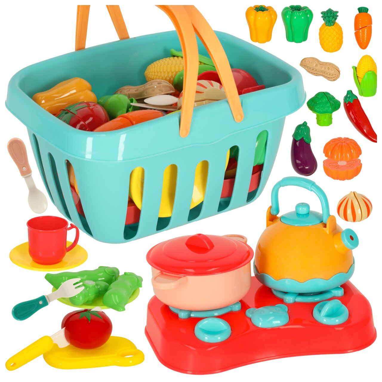 Using toys, a child can learn about different types of vegetables and fruits, which can be an excuse to expand a toddler's diet. The child learns to hold cutlery correctly, and thanks to the removable Velcro straps, they can see what the vegetables look like after being cut.