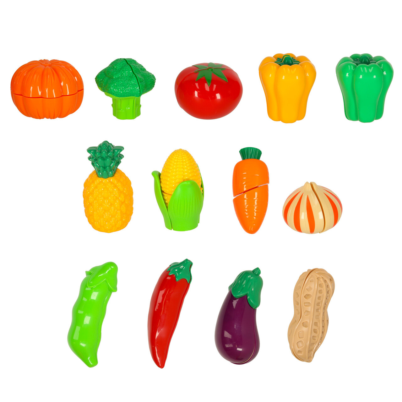 Number of pieces in the package: (13 pieces of vegetables and fruits for cutting using Velcro segments + 15 pieces of kitchen utensils).
