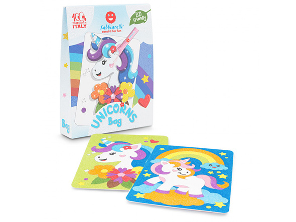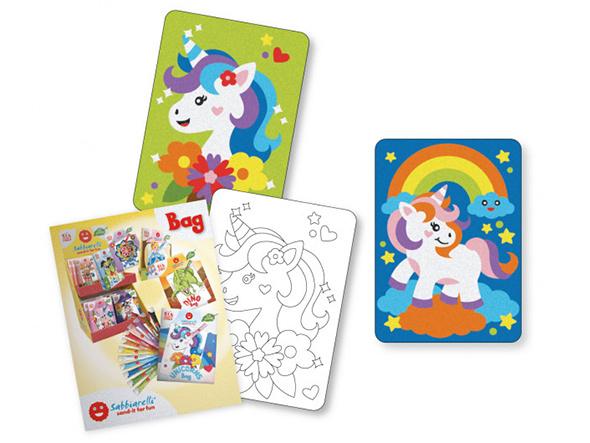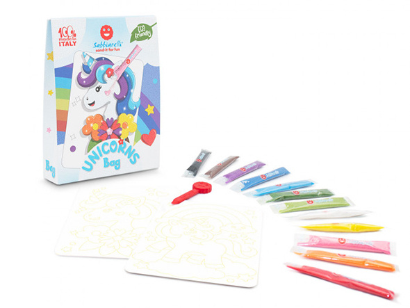 A creative and unique art set for children to color sand made from ground marble, this time in a small practical Sabbiarelli bag. Sabbiarelli's Magic Sand Coloring Books are an art set designed for children, where direct contact with sand is an educational aspect in relation to the materials used. Working with sand in coloring pictures is not only extremely fun for children, but it also allows them to develop their imagination and create beautiful pictures without using scissors, glue, or paints. This creative set for boys and girls is made only from safe and non-toxic materials. Sabbiarelli sand coloring books are ideal for playing with friends and also make a great gift idea.