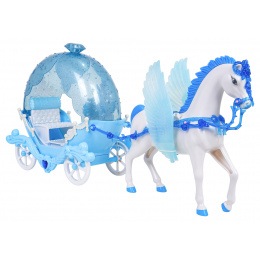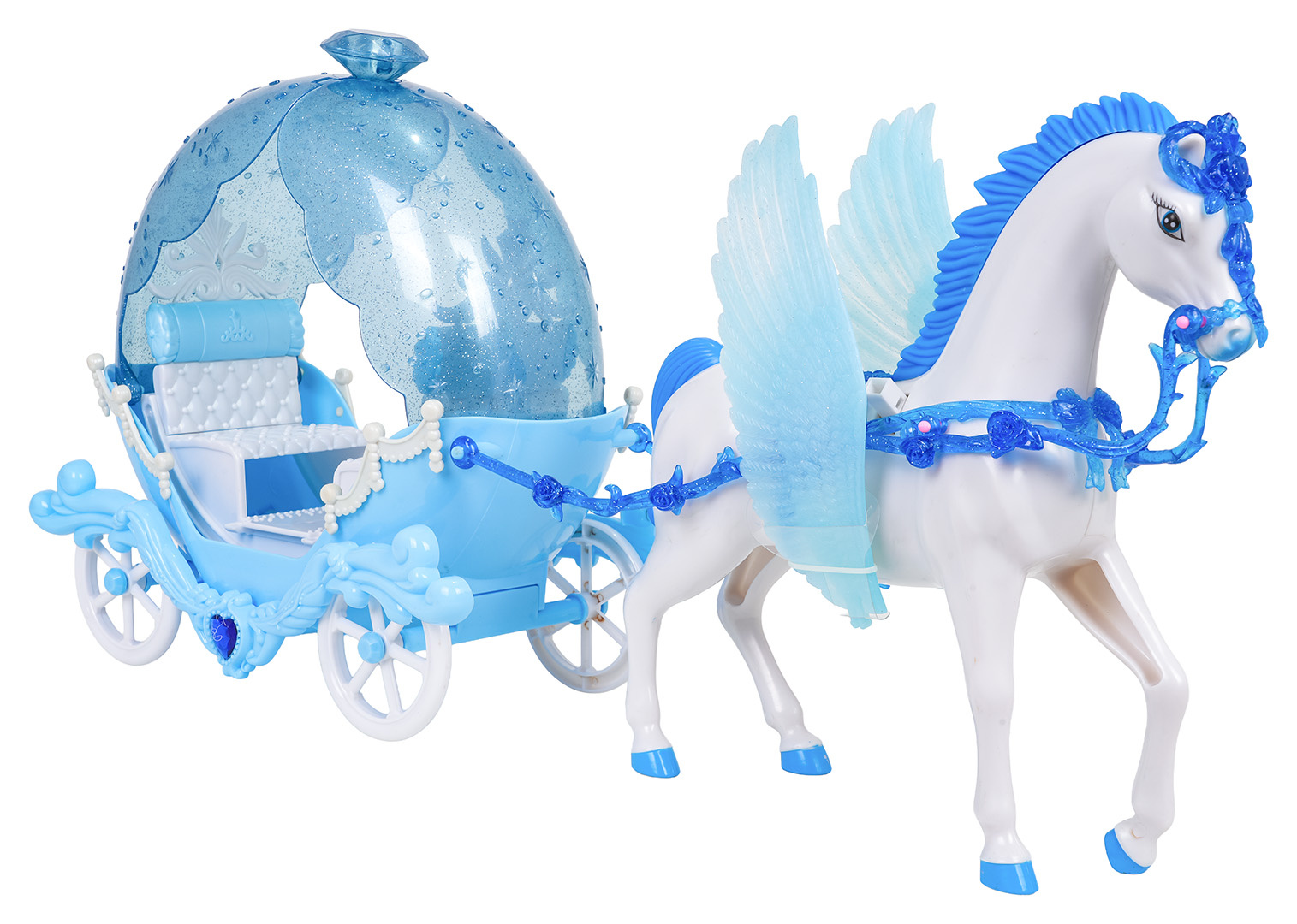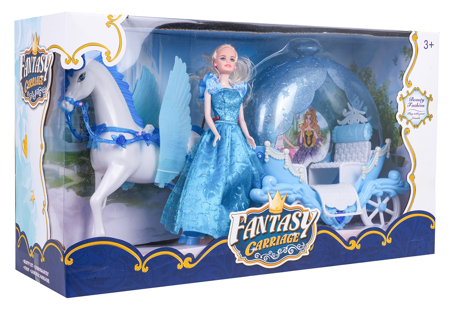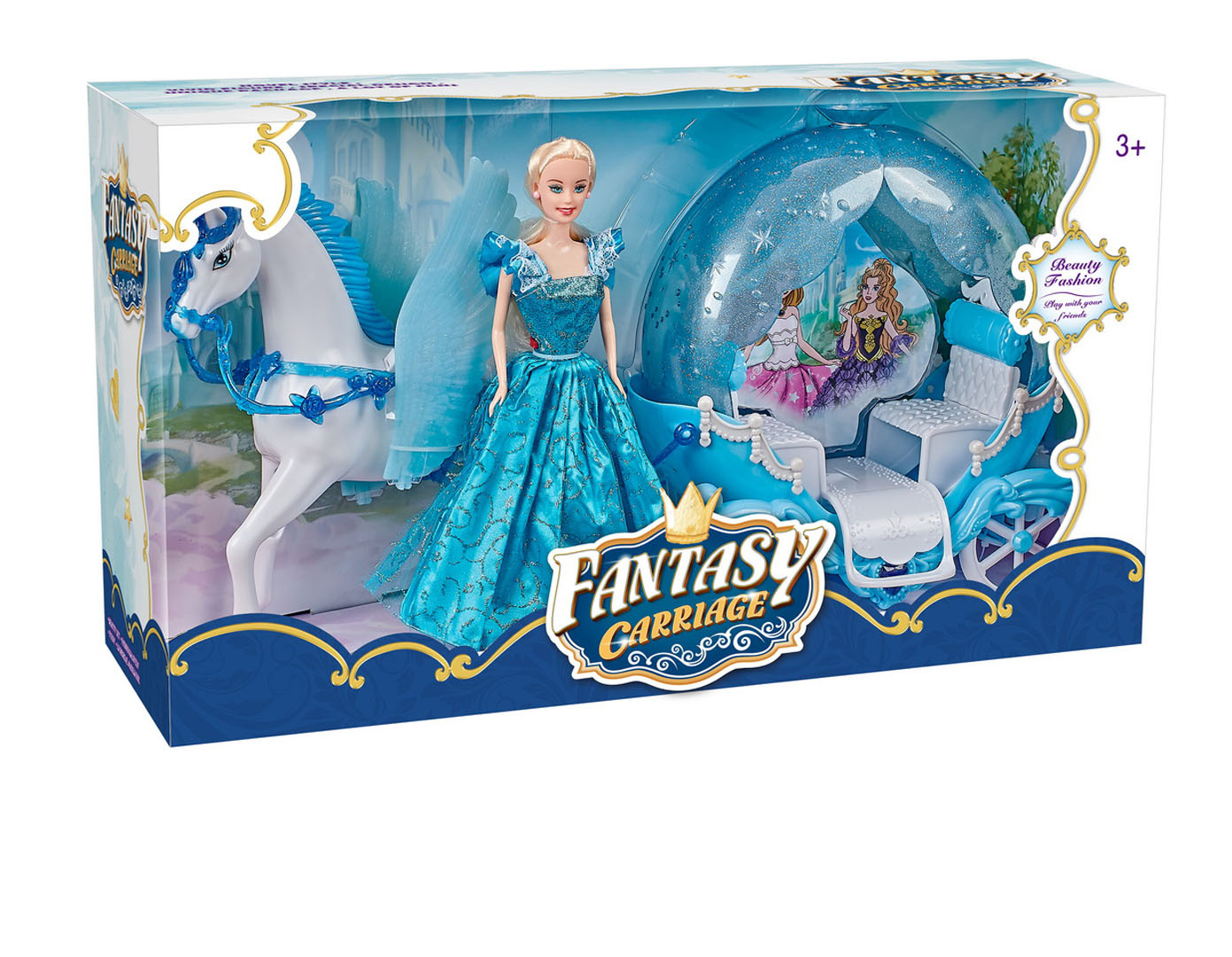 Set of doll, horse, carriage, for children over three years old. The set allows you to enter the world of magic. The doll has movable arms and legs, a beautiful ball gown, and long hair. We can unfold the grasshopper's wings (manually).