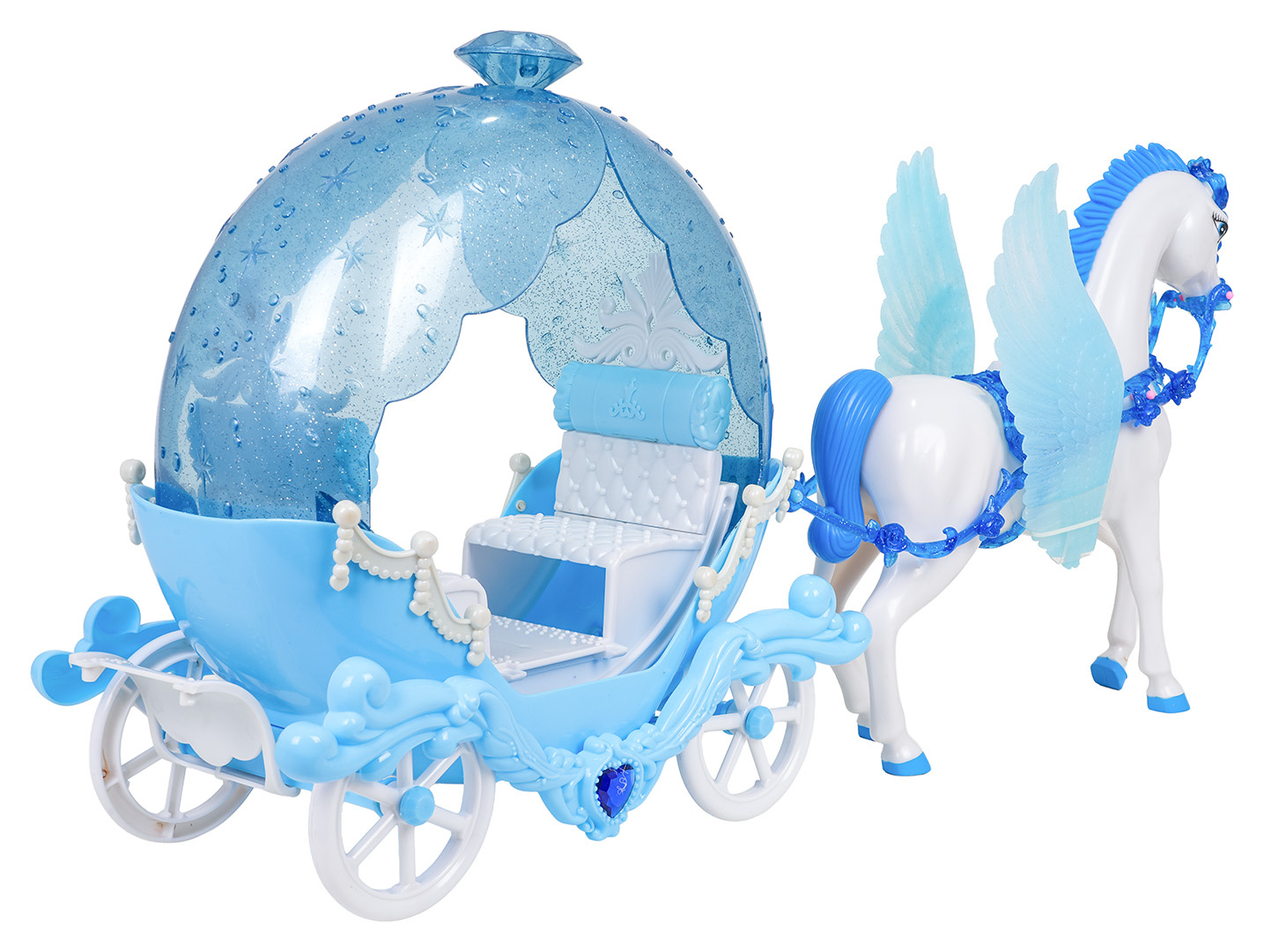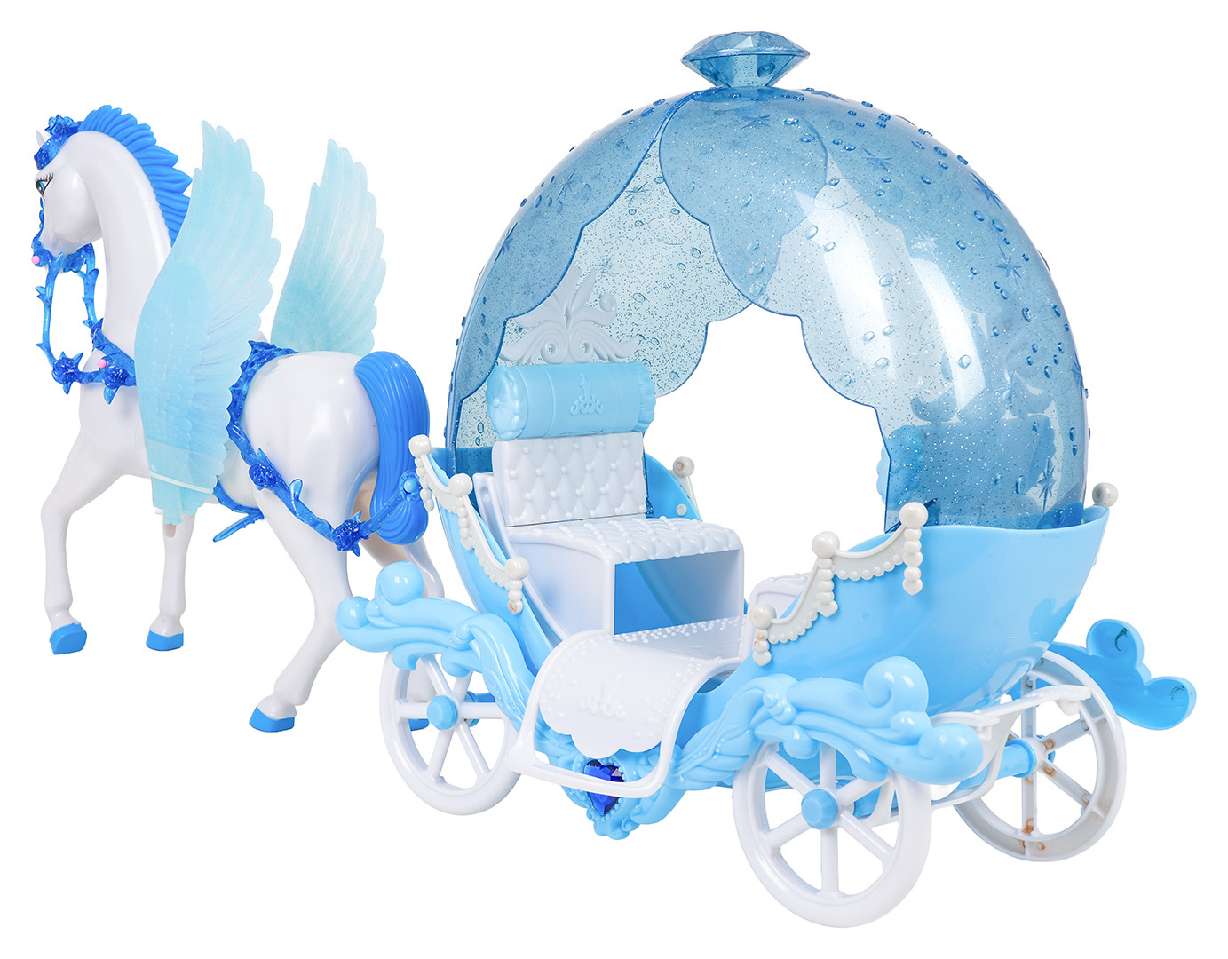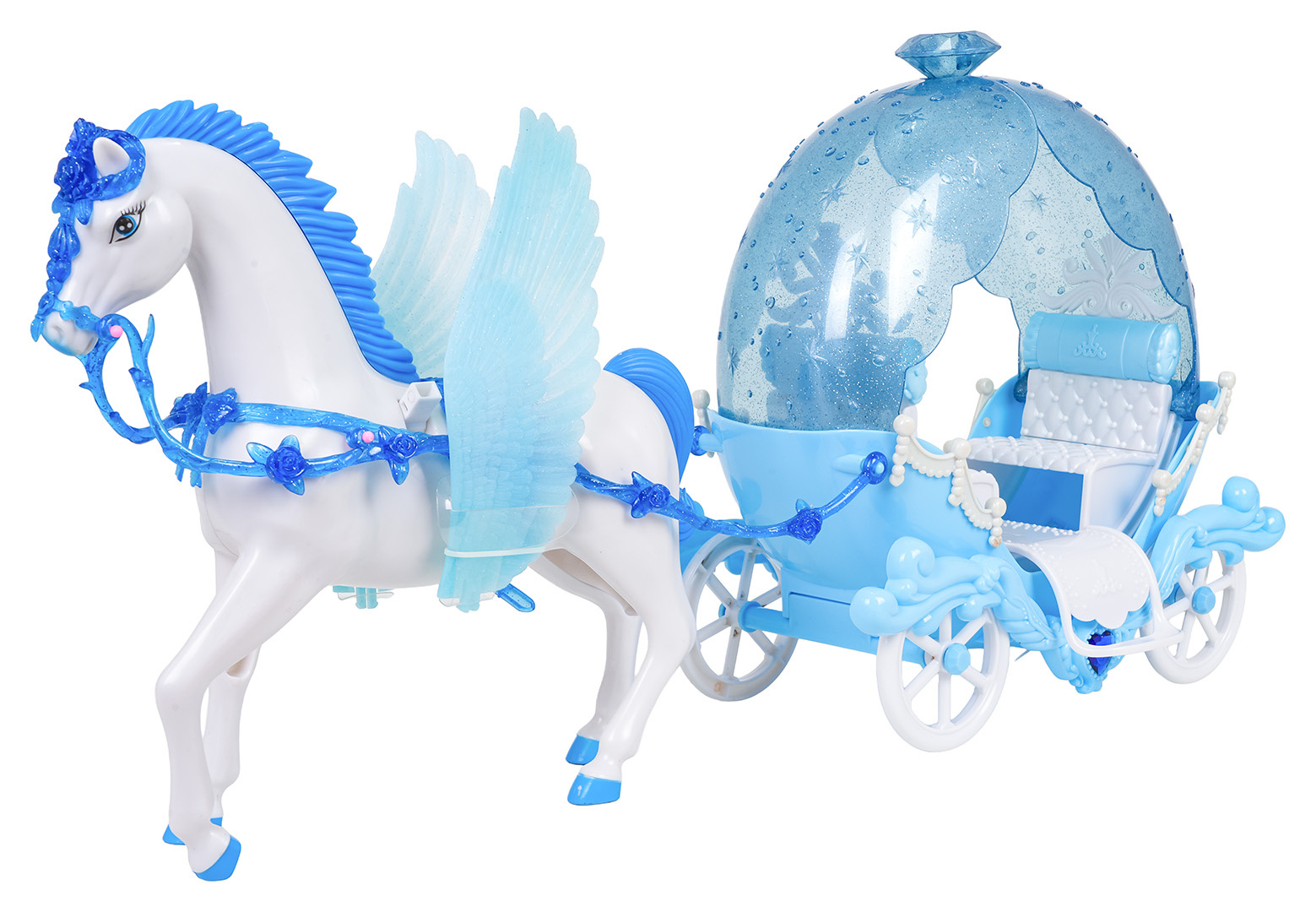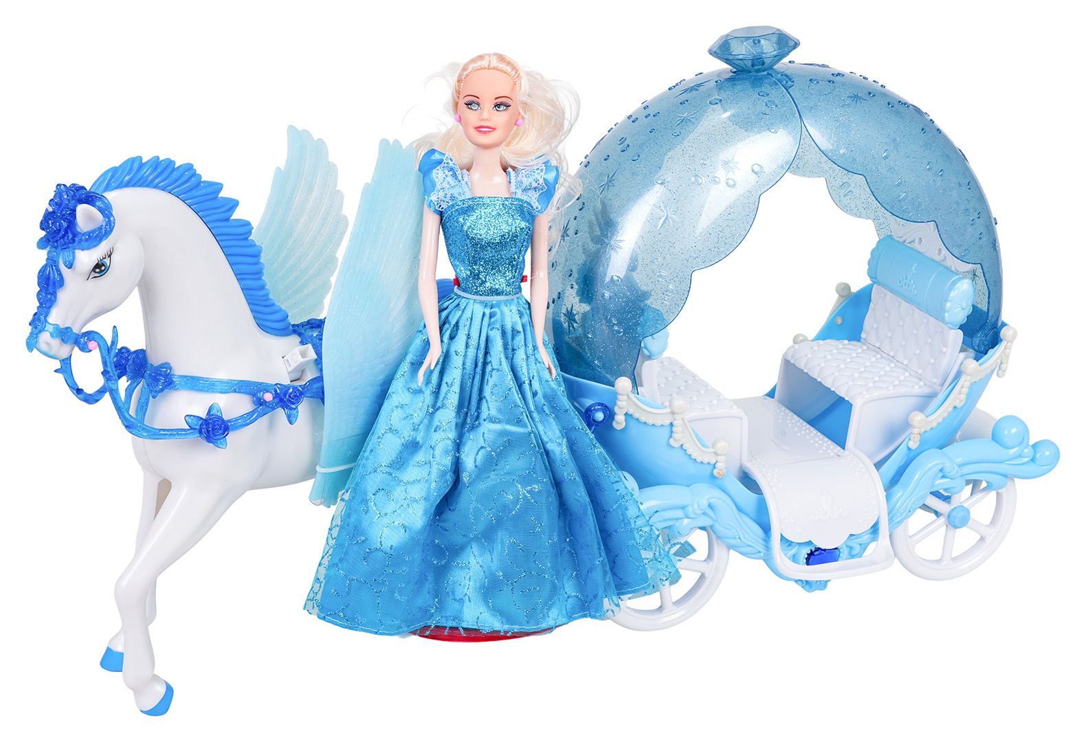 Set of doll, horse, carriage, for children over three years old. The set allows you to enter the world of magic. The doll has movable arms and legs, a beautiful ball gown, and long hair. We can unfold the grasshopper's wings (manually).